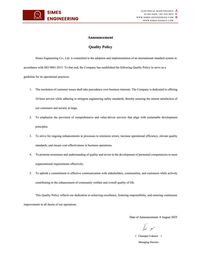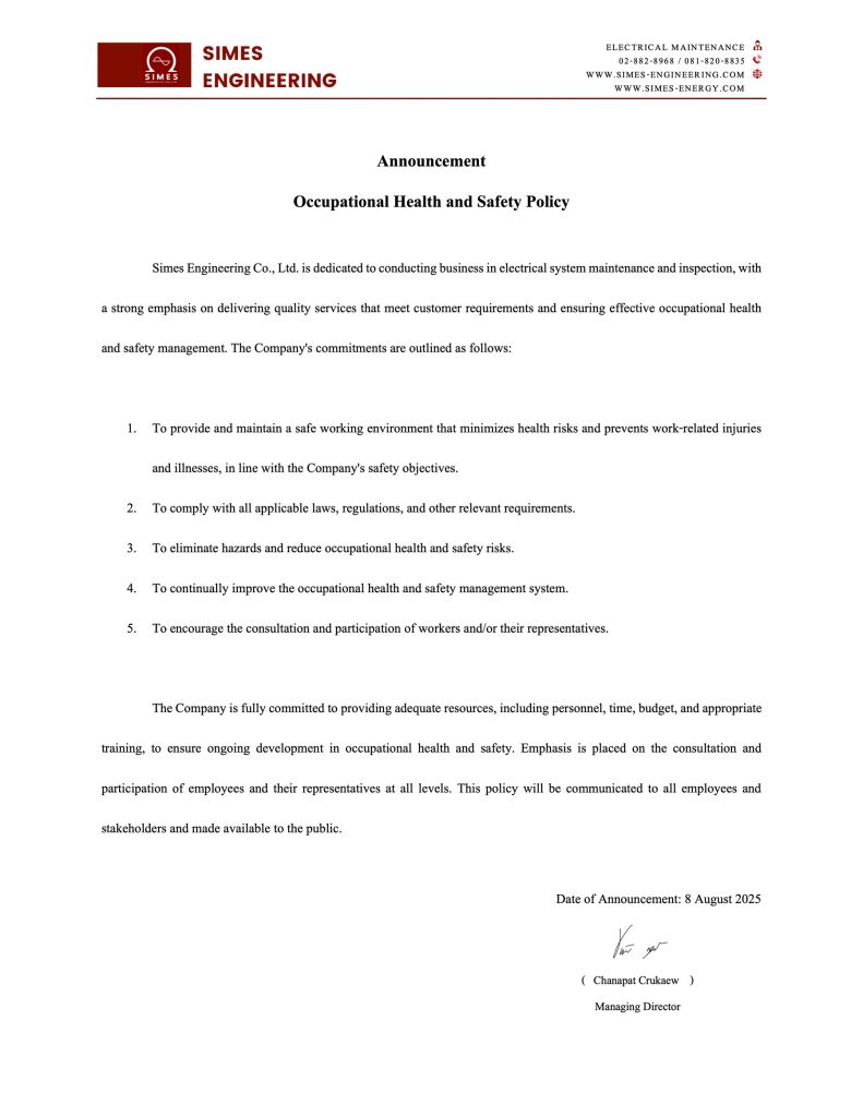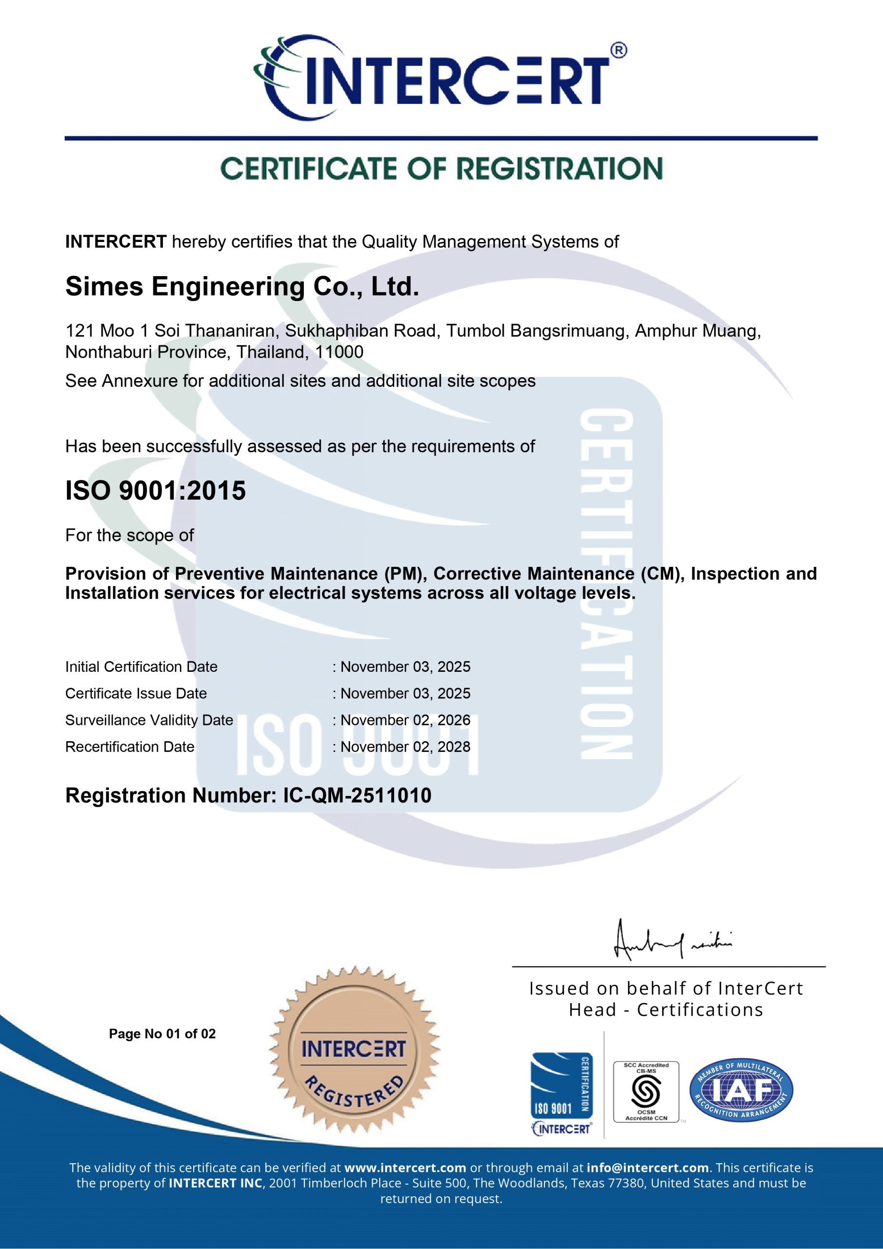 ปัจจุบัน บริษัทไซเมส เอ็นจิเนียริ่ง จำกัด ดูแลบำรุงรักษาระบบไฟฟ้าให้โรงงานอุตสาหกรรมขนาดใหญ่ ในนิคมอุตสาหกรรมมากกว่า 30 โรงงาน และอาคารสูงมากกว่า 10 แห่ง